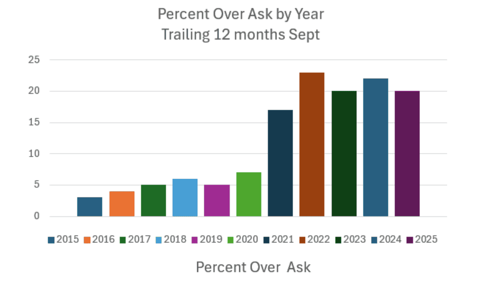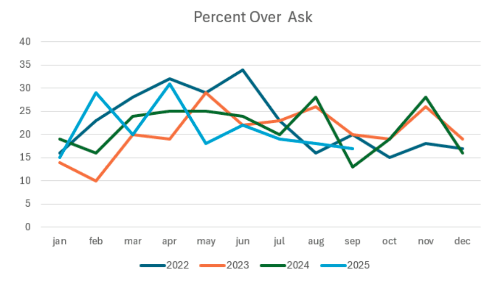 16 homes closed in September with a 17% price premium over ask, up from 13% last Sept, but down from a 20% 12 month average. The median sales price of $936k in Sept was the lowest we’ve seen since Feb 2024. These sales results aren’t really indicative of the fall market as they represent, for the most part, houses listed in the summer.
