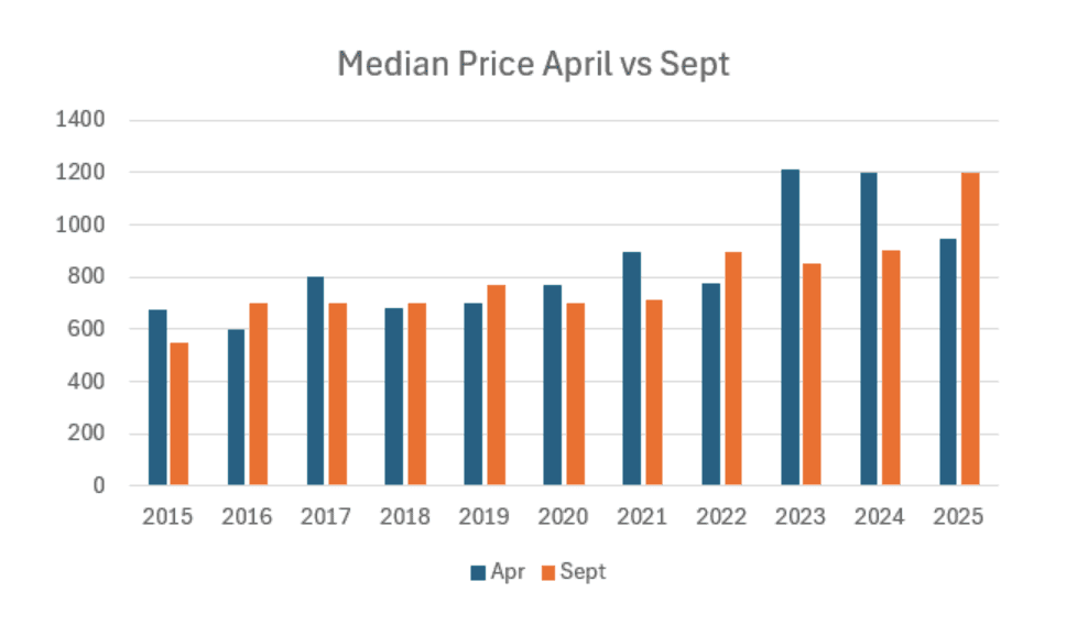 You may ask, “shouldn’t asking prices creep up with sales prices, closing the price premium gap, especially in the fall, dictated by Spring trends?” We do see premiums typically higher in the spring (figure B), but it seems to be result of zealous buying activity and not prices creeping up in the fall to meet expectations. If you look at figure C, you will see that April asking prices have been on par with September, and actually a good bit higher in ‘23 and ‘24. It could be that more owners of expensive homes choose to list in Spring. We did, however, see median prices bump up in September from April prices this year, but they still haven’t moved past levels of the past 2 springs. It will be interesting to see if the price premium gap shrinks on higher fall asking prices.